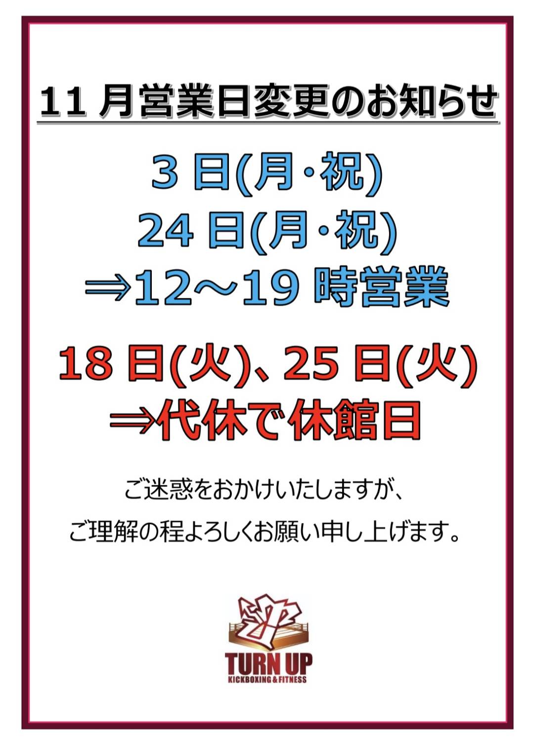 2025年11月の営業日変更のお知らせ 未分類 2025.11.01 高槻のキックボクシングジム「TURN UP(ターンアップ)」のスタッフです。 11月3日(月祝)、11月24日(月祝)は、12時~19時で営業いたします。 代わりに11月18日(火)と11月25日(火)は、代休日とさせていただきます。 みなさま、ご理解のほど、よろしくお願いいたします。 スタッフ一同 Tweet