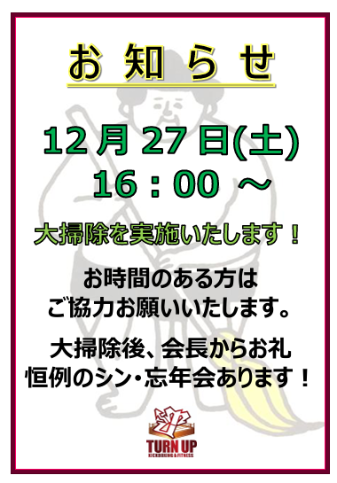 高槻のキックボクシングジム「TURN UP(ターンアップ)」のスタッフです。 いよいよ年末が近づいてきました。…